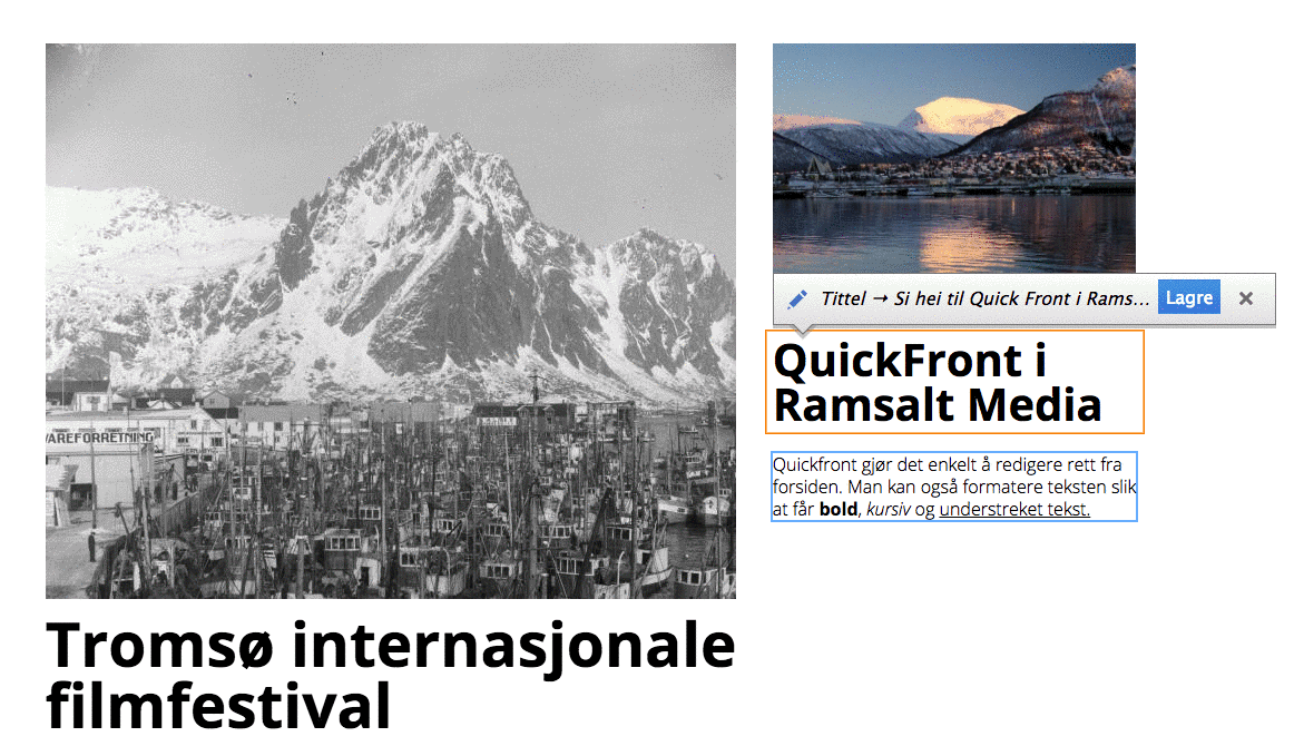 I Ramsalt jobber vi kontinuerlig med ulike funksjoner for å gjøre jobben lettere for nettredaksjoner. Det siste tilskuddet er en plugin vi kaller QuickFront der man på nettsidens forside enkelt kan redigere innholdet der det er, uten å gå inn på en egen administrasjonsside for å redigere hver artikkel.