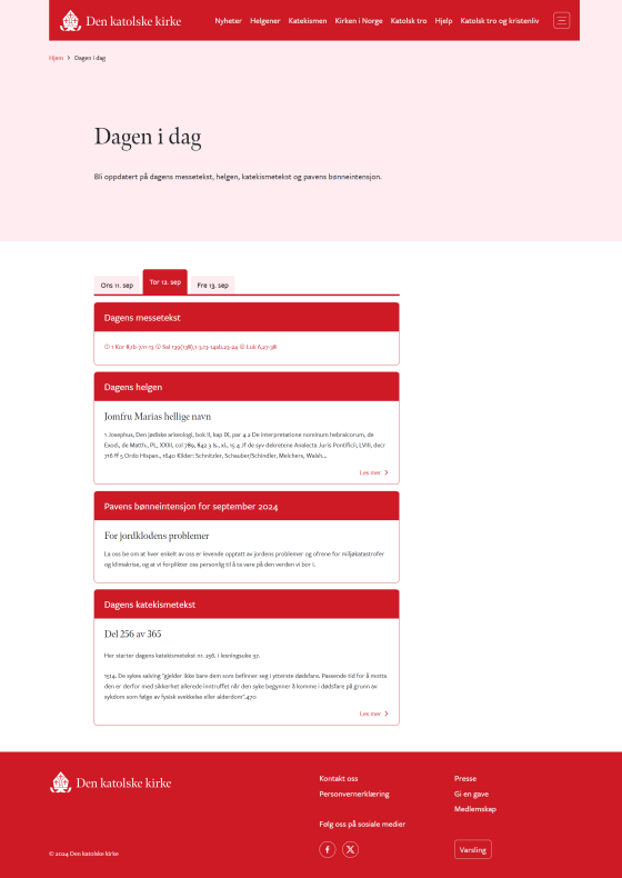 En side som skal hjelpe katolikker med å oppfylle sine åndelige behov gjennom daglig religiøs praksis. Her finner du ulike forslag som kan berike din daglige rutine, blant annet teksten til den daglige messen, et daglig helgenminnesmerke, månedlige bønneinvitasjoner fra paven og et utdrag fra den daglige katekismen.